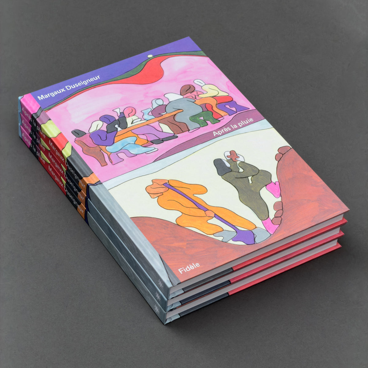 Après la pluie, by Margaux Duseigneur, unfolds across three movements where the “after” is reinvention rather than collapse. Between visual poems and communal rituals, we move from edible landscapes and hand-shaped gardens to wild carnivals — joyful uprisings against violence — composing a tender, political ecology of care and collective life. The pages carry a strong pictorial charge, built in two superposed layers — pencil on tracing paper over color made with markers — so that forms stay supple, shifting, and alive; resilience appears in dreamlike, abstract modes, as if art and craft were answers to the present.