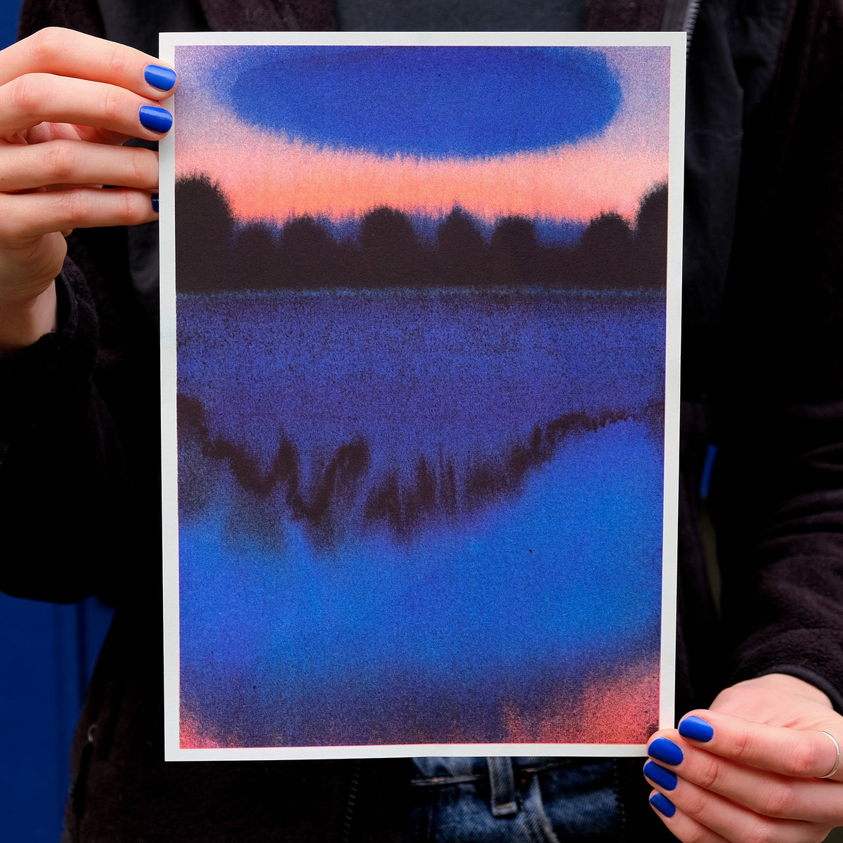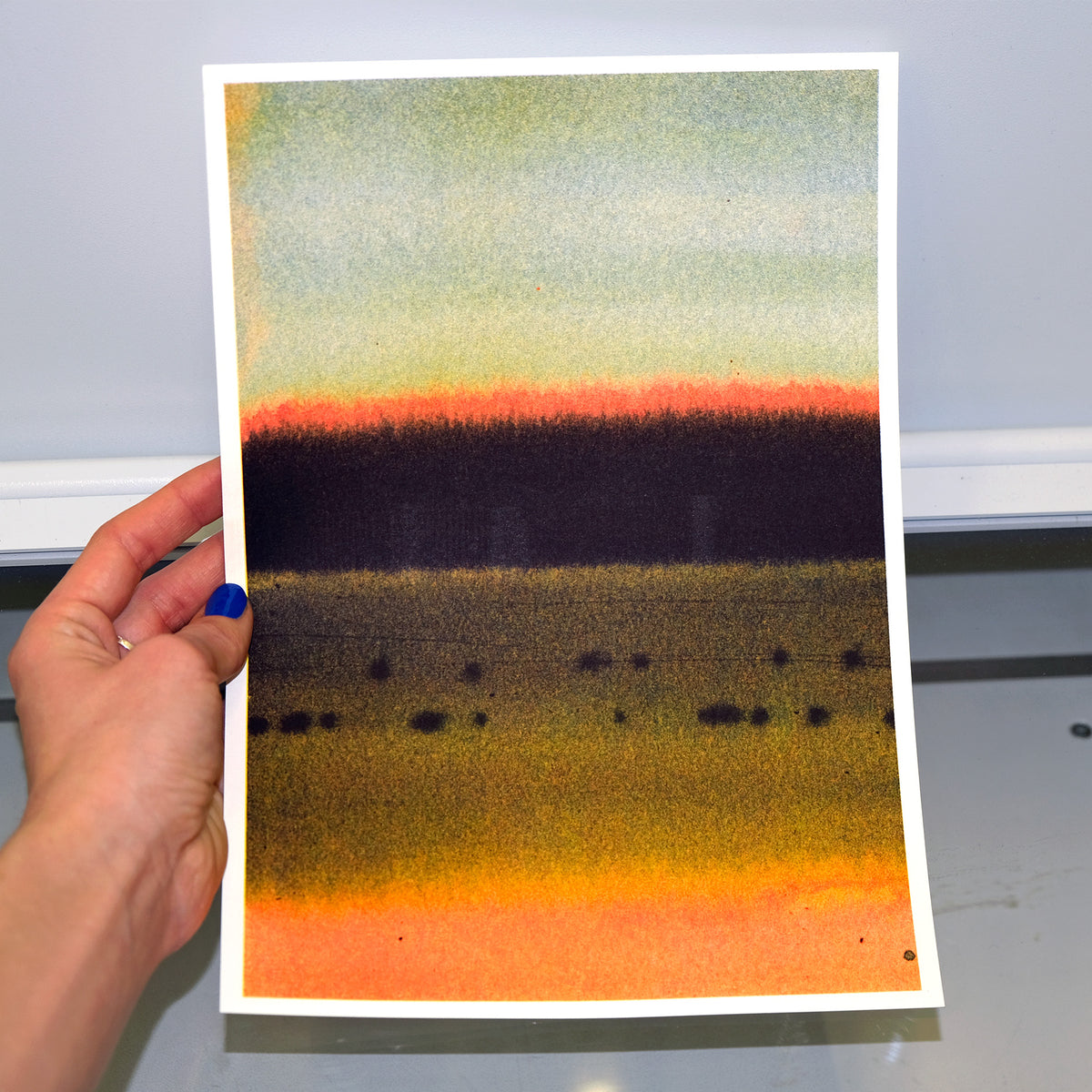 4 color print limited to 100 copies. 21 x 29 cm, on Munken Pure Rough paper. Risograph prints