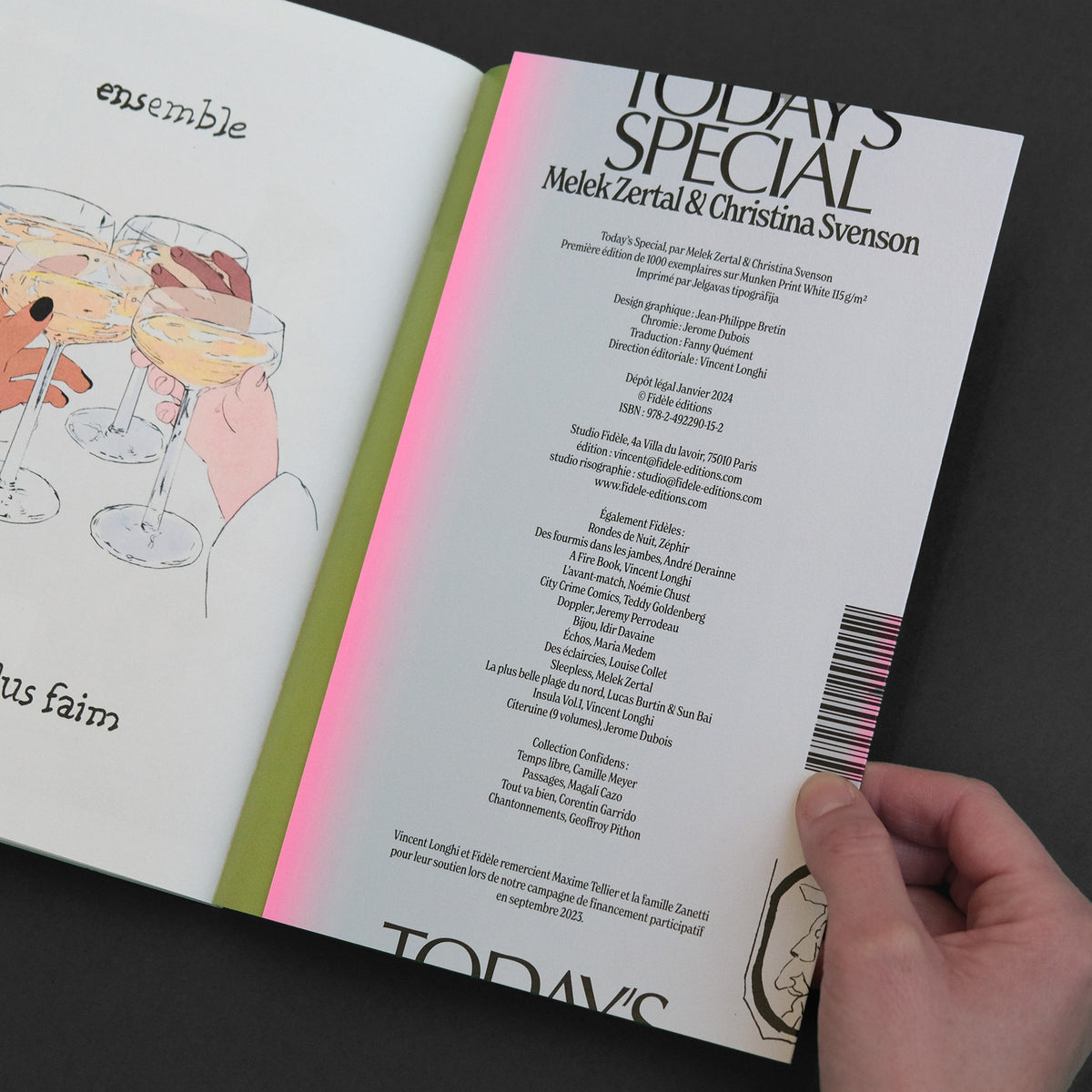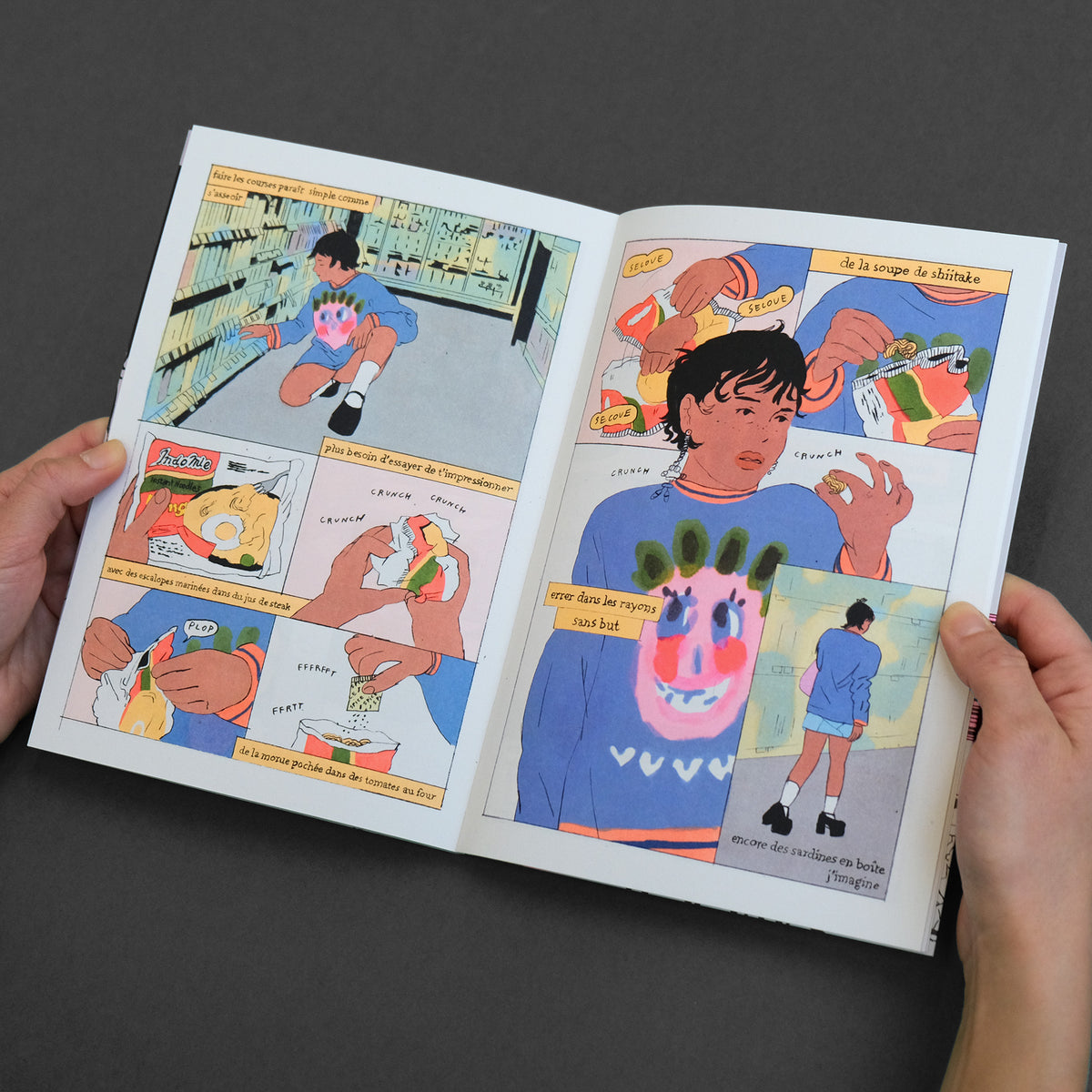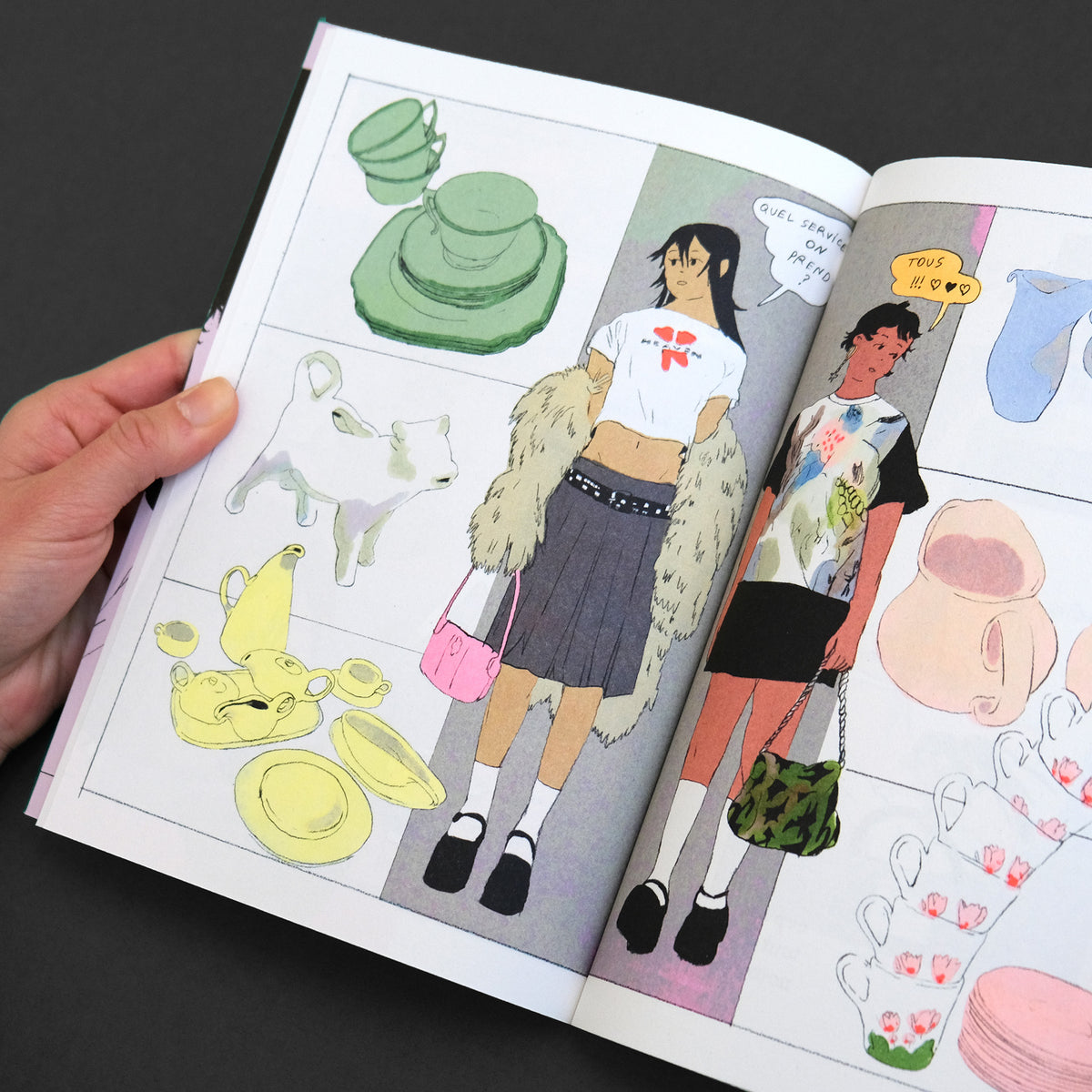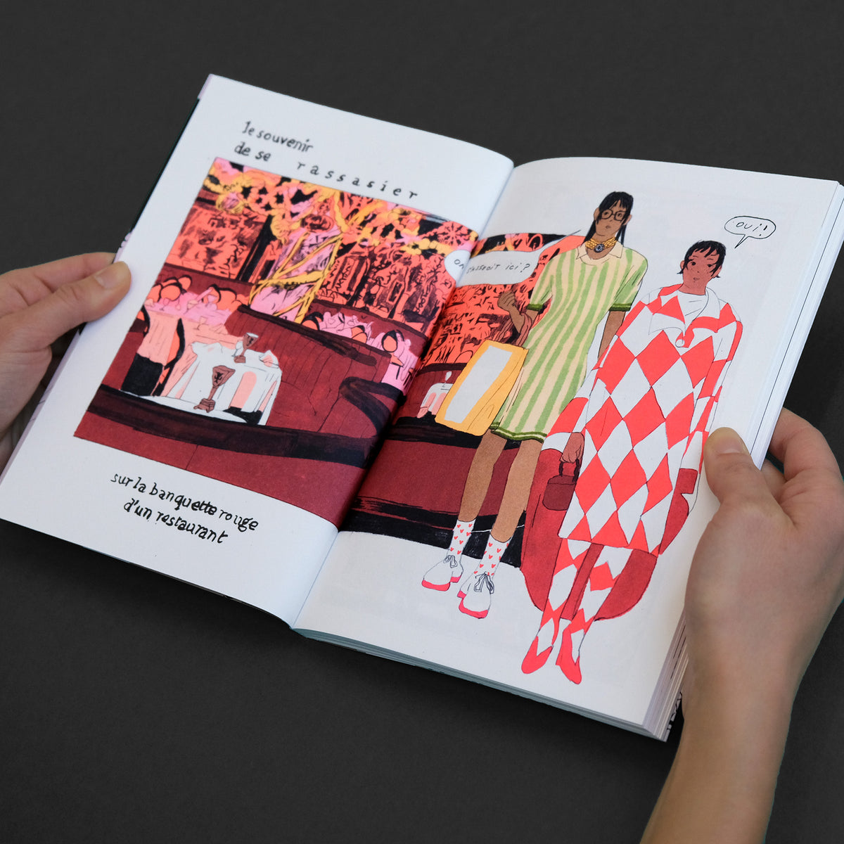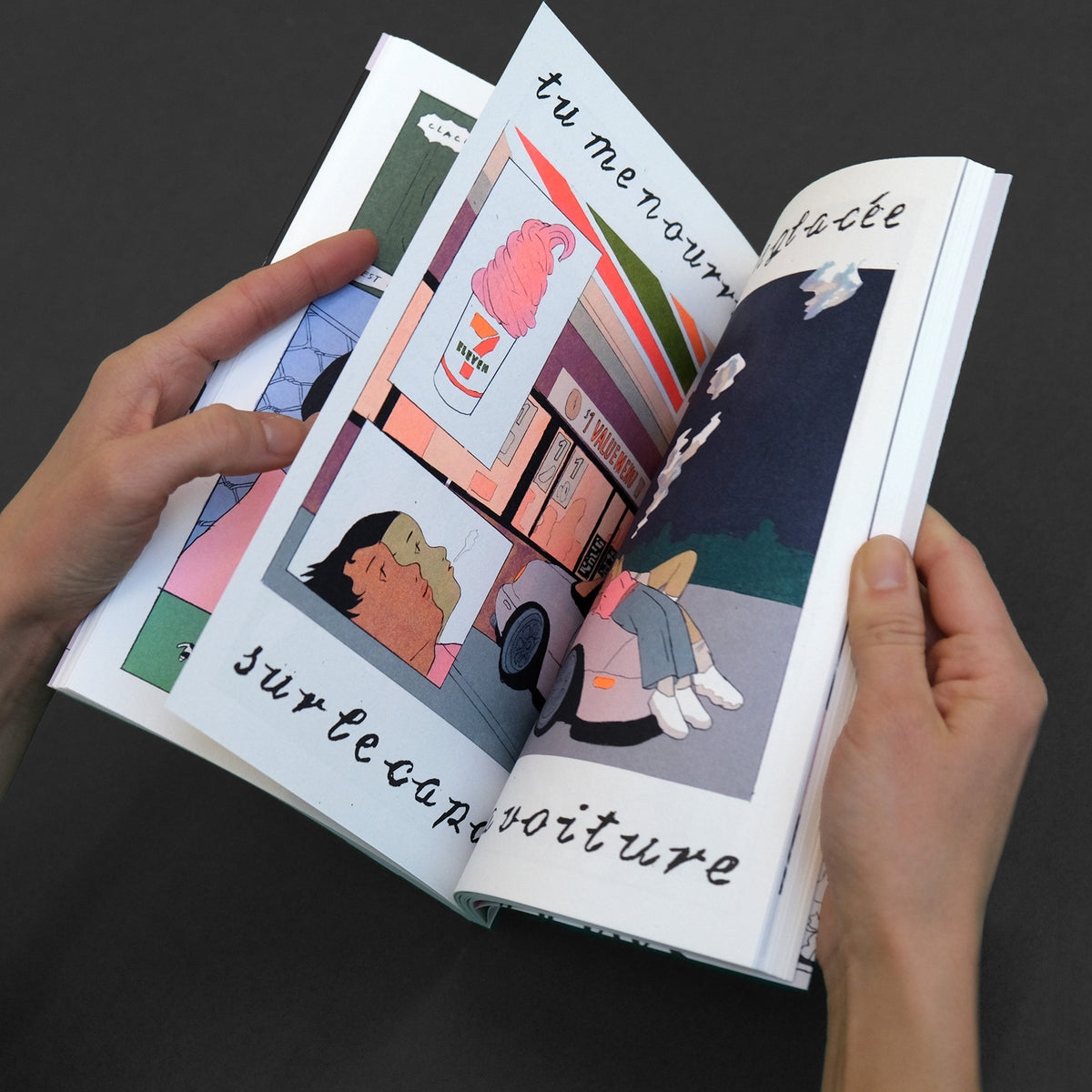 The book has been printed in four-color offset using fluorescent inks, crafted with the same care as our risograph printed editions. We also use a voluminous and matte paper, maintaining the materiality that suits us. This book is a French version of the original American edition by Perfectly Acceptable